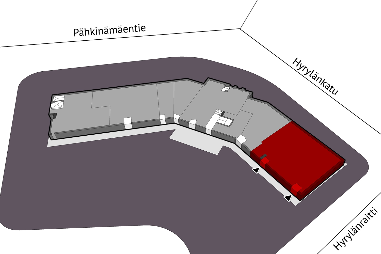 Vapaana katutasosta valoisa liiketila, joka näkyy hyvin kolmeen suuntaan. Toimitila koostuu osittain avotilasta ja osittain huoneista. Tiloihin on käynti katutasolta. Vastapäätä kiinteistöä sijaitsee Hyrylän S-marketin kauppakeskus, jossa on useita eri liikkeitä. Bussipysäkki n. 300m etäisyydellä.