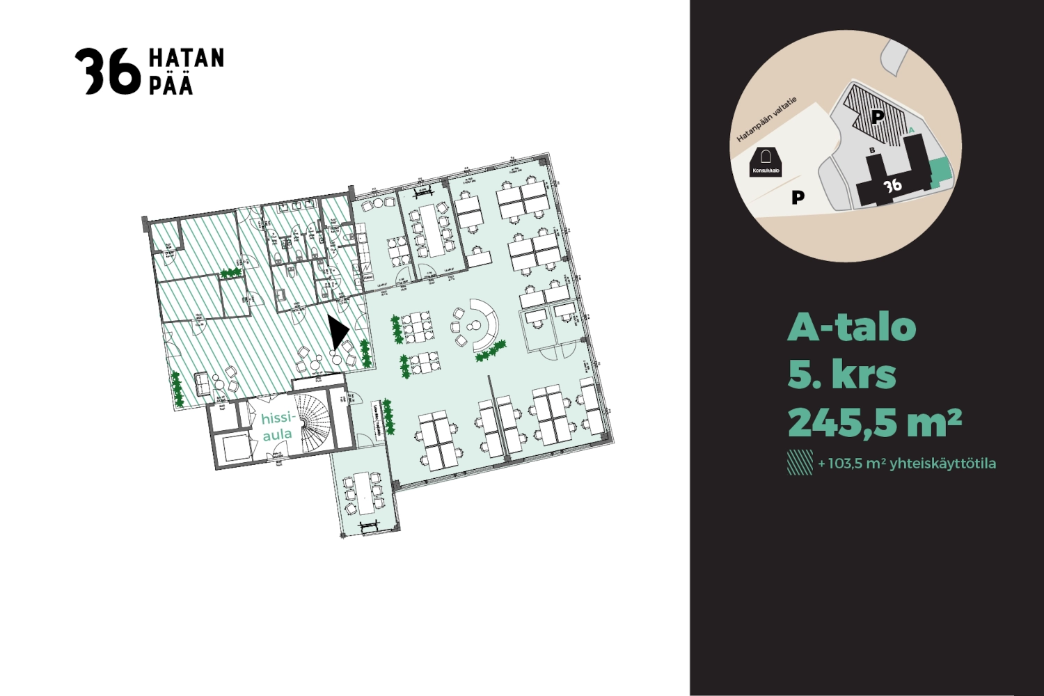 Vuokrattavana moderni viidennen kerroksen toimistotila. Valoisassa tilassa on erittäin toimiva pohja ja suuret ikkunat kolmeen suuntaan. Toimitilan pinta-ala on 245 m², jonka lisäksi tilalle kuuluu 30 m² jyvitys yhteiskäyttötiloista.