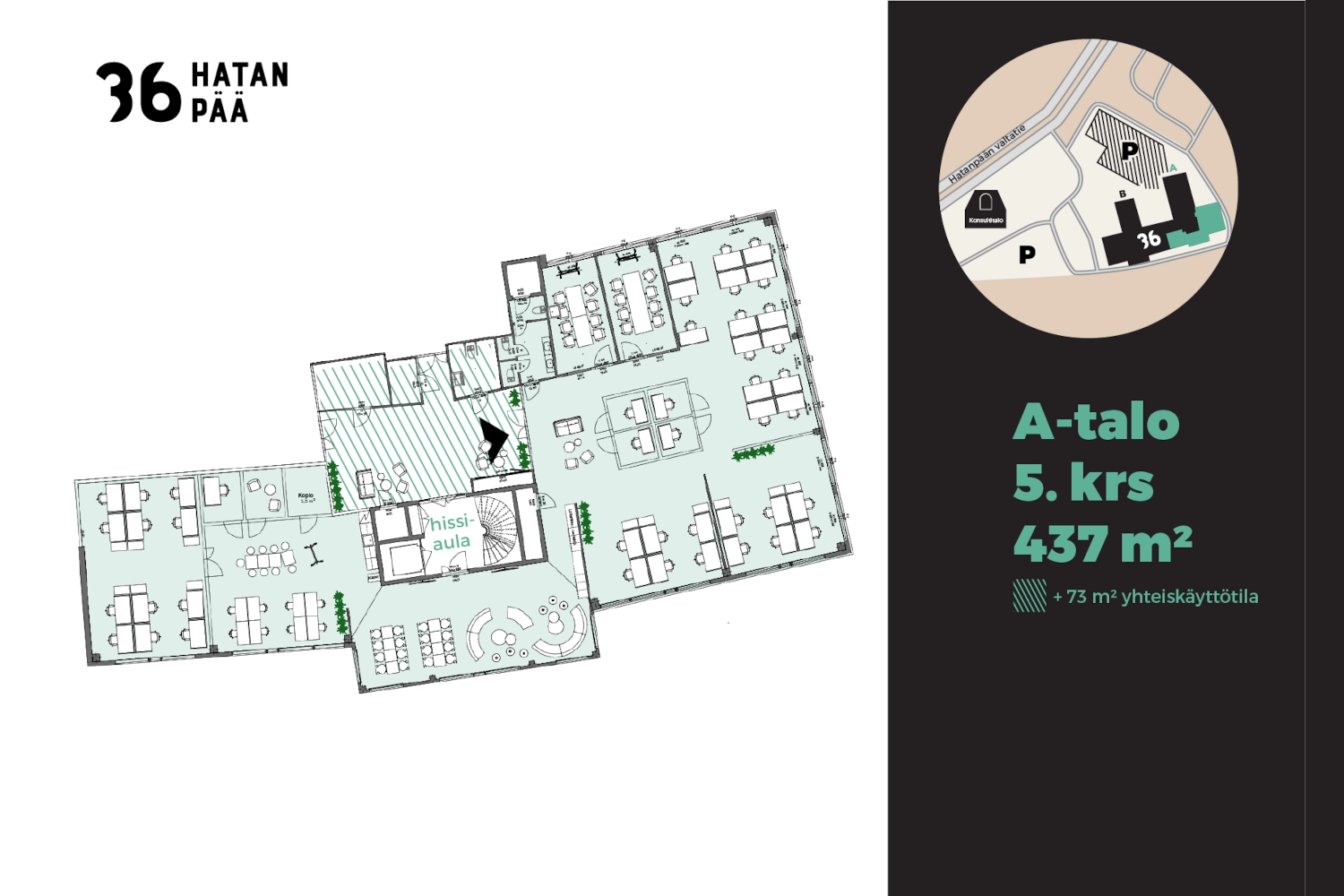 Vuokrattavana nykyaikainen ja valoisa viidennen kerroksen toimistotila. Pääosin avotilasta koostuvassa tilassa on toimiva pohja ja suuret ikkunat kolmeen suuntaan. Toimitilan pinta-ala on 437 m², jonka lisäksi tilalle kuuluu 36 m² jyvitys yhteiskäyttötiloista.