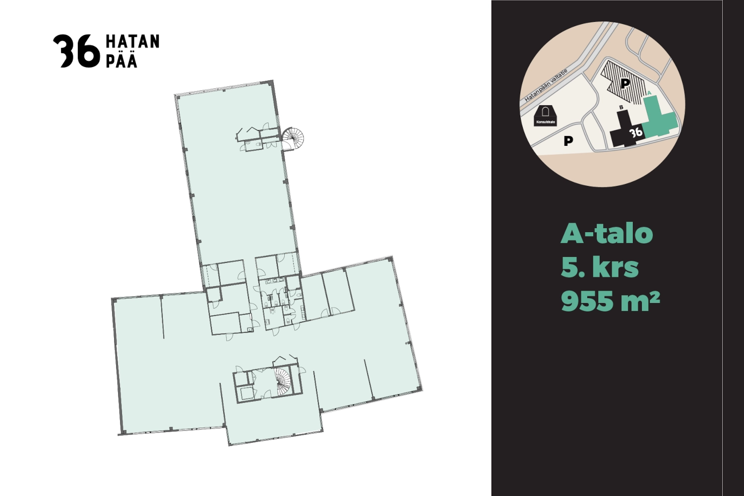 Vuokrattavana suuri, noin puolet viidennestä kerroksesta kattava toimistotila hilattain modernisoidusta 36Hatanpäästä. Nykyaikaisessa toimitilassa on toimiva ja avoin pohja, jota voidaan muokata tarpeen mukaan. Valoa tuovat suuret ikkunat neljään suuntaan.