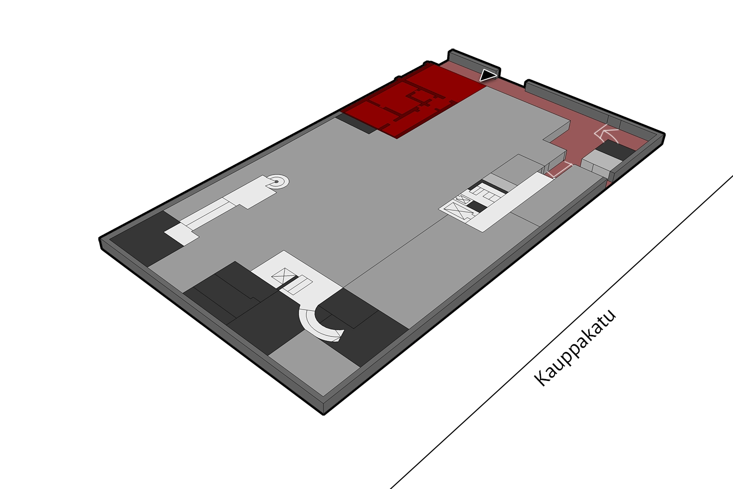 Varastotilaa kellarikerroksen väestönsuojassa ja etutilassa. Logistinen yhteys kuorma-autolle Väinönkadun ajorampin kautta.